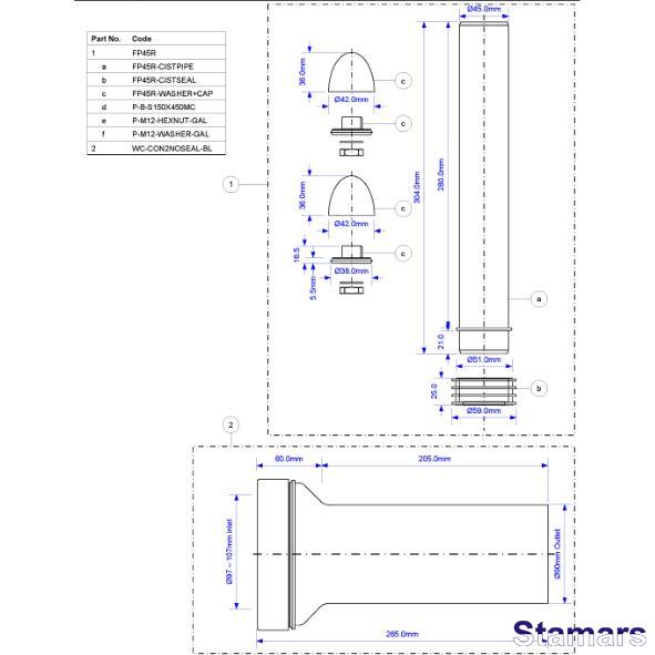 Uzstādīšanas komplekts slēptajām tvertnēm. Komplektā kanalizācijas pieslēgums 97-107x90mm, L-265mm, taisns. Padeves caurule 60x45mm L-304mm un savienojošo skrūvju komplekts ar baltiem vāciņiem.