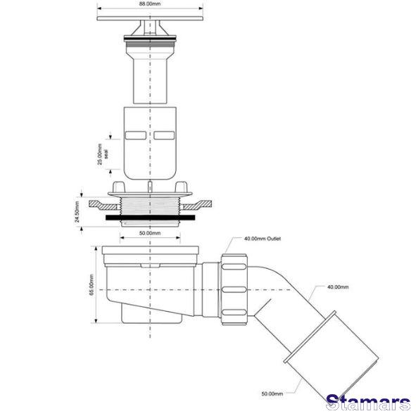Dušas sifons ar elementu, kas ļauj tīrīt no augšas. Sifona augstums - 65 mm. Vāks, diametrs 88mm, izgatavots no nerūsējošā tērauda. Paredzēts dušas paliktnei ar atvērumu no 50 līdz 63 mm. Plūsmas jauda – 26 l/min. ar ūdens stabu 120 mm.