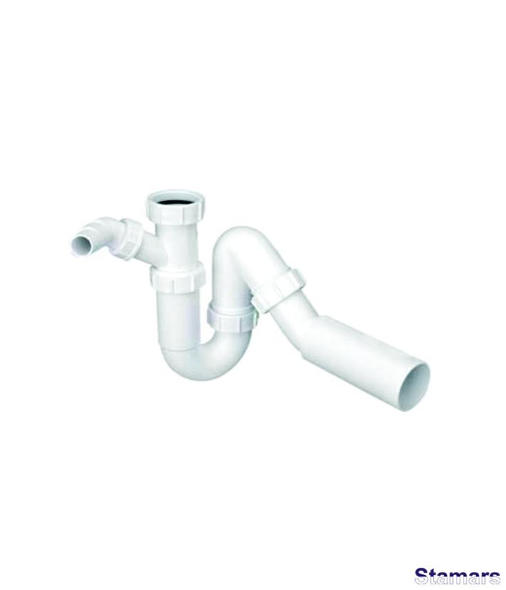 Caurules izlietnes sifons 1,1/2″x50mm ar savienojumu ar veļas mašīnu vai trauku mazgājamo mašīnu, bez kanalizācijas. Caurlaide – 71l/min. ar ūdens stabu 120 mm.