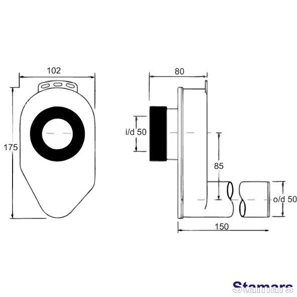 Slēptais pisuāra sifons 50x50mm ar horizontālu izeju.