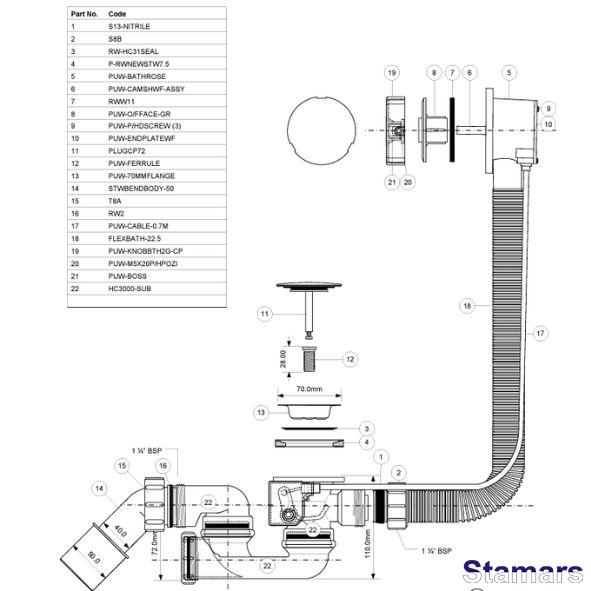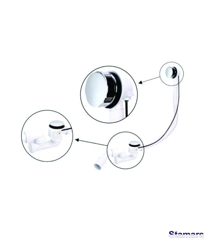 Iztukšošanas un pārplūdes komplekts vannai un dziļai dušas paliktnei ar kloķi un aizbāzni notekas aizvēršanai un atvēršanai. Poga izgatavota no ABS. 1,1/2″x40/50 mm izeja. Tīrīšanas iespēja, veicot sānu pārbaudi.