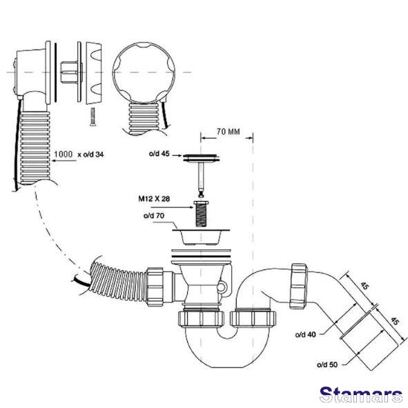 Balts notekas un pārplūdes komplekts vannai un dziļai dušas paliktnei ar kloķi un aizbāzni notekas aizvēršanai un atvēršanai. Poga izgatavota no ABS. 1,1/2″x40/50 mm izeja.
