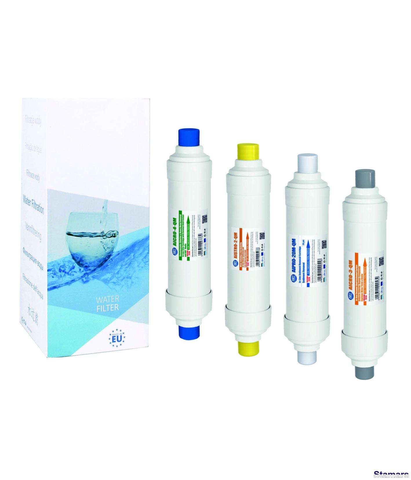 Komplekts EXCITO-B sitēmām četri lineārie kartr.: AIPRO-20M-QM – kartr. no polipropilēna šķied., attīra ūdeni no meh. piesārņojumiem. AISTRO-2-QM – divpakāpju kartr. atdzelžo un mīkstina ūdeni. AICRO-3-QM – kartr. ar aktīvēto ogli no kokosu riekstu čaulas, attīra ūdeni no hlora un org. piesārņojumiem. AICRO-4-QM - divpakāpju kartr.. KDF – novērš baktēriju un vīrusu veidošaos, pazemina smago metālu un dzelzs konc., kā arī attīra ūdeni no sērūdeņraža un pesticīdiem. Aktīvēta ogle no kokosu riekstu čaulas attīra ūdeni no hlora un org. piesārņojumiem, uzlabo ūdens smaržu un garšu. Darba temp. 2 - 45 oC.