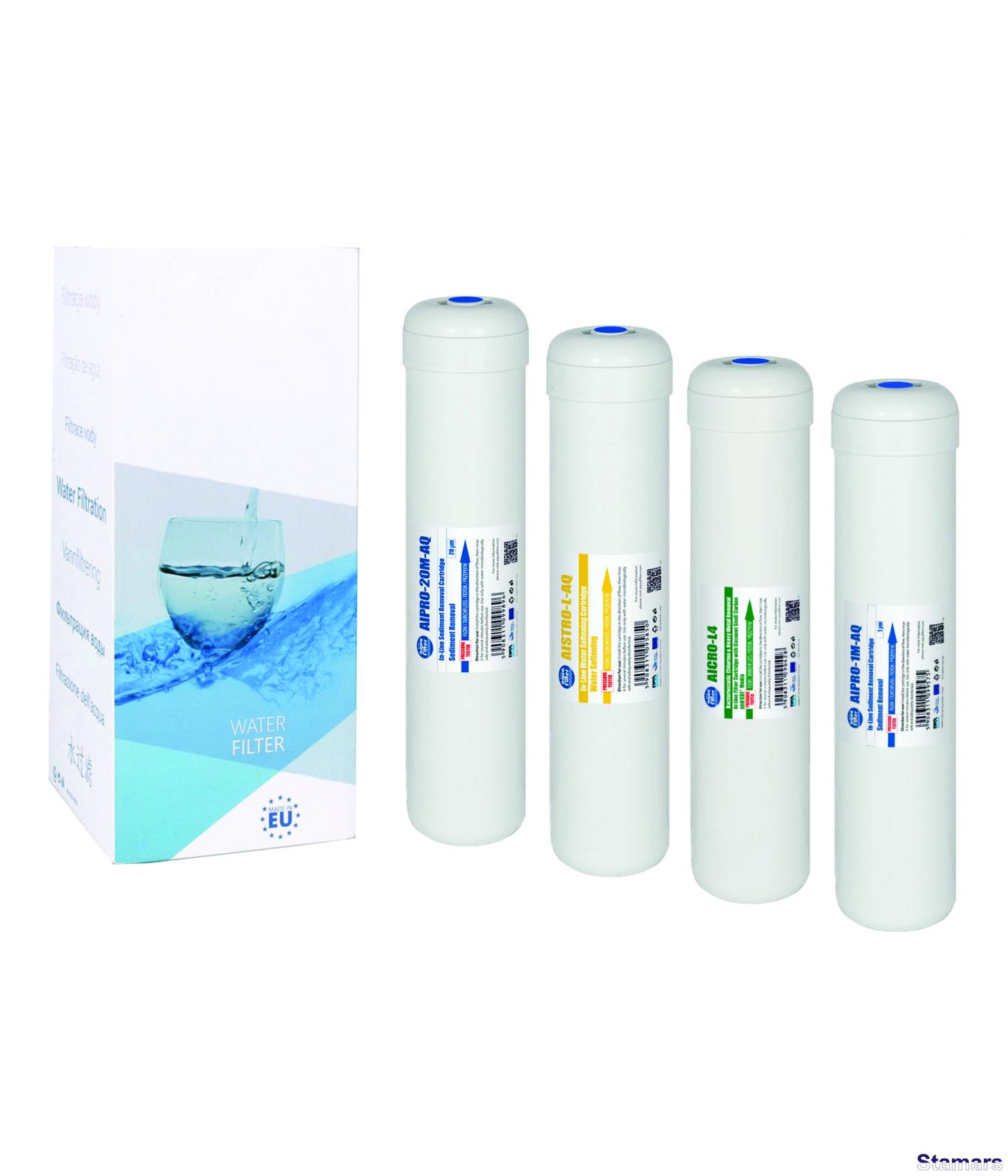 Komplekts EXCITO-ST sitēmām. Ietilpst četri lineārie kartr.: AIPRO-20M un AIPRO-1M – kartr. no polipropilēna šķied., attīra ūdeni no mehāniskiem piesārņojumiem. AICRO-L3 – Kartridžs ar aktīvēto ogli no kokosu riekstu čaulas, attīra ūdeni no hlora un organiskiem piesārņojumiem. AICRO-L4 - Divpakāpju kartridžs. KDF – novērš baktēriju un virusu veidošanos, pazemina smago metālu un dzelzs koncentrāciju, kā arī attīra ūdeni no sērūdeņraža un pesticīdiem. Aktīvēta ogle no kokosu riekstu čaulas attīra ūdeni no hlora un org. piesārņojumiem, uzlabo ūdens smaržu un garšu. Darba temp. 2 - 45 oC.