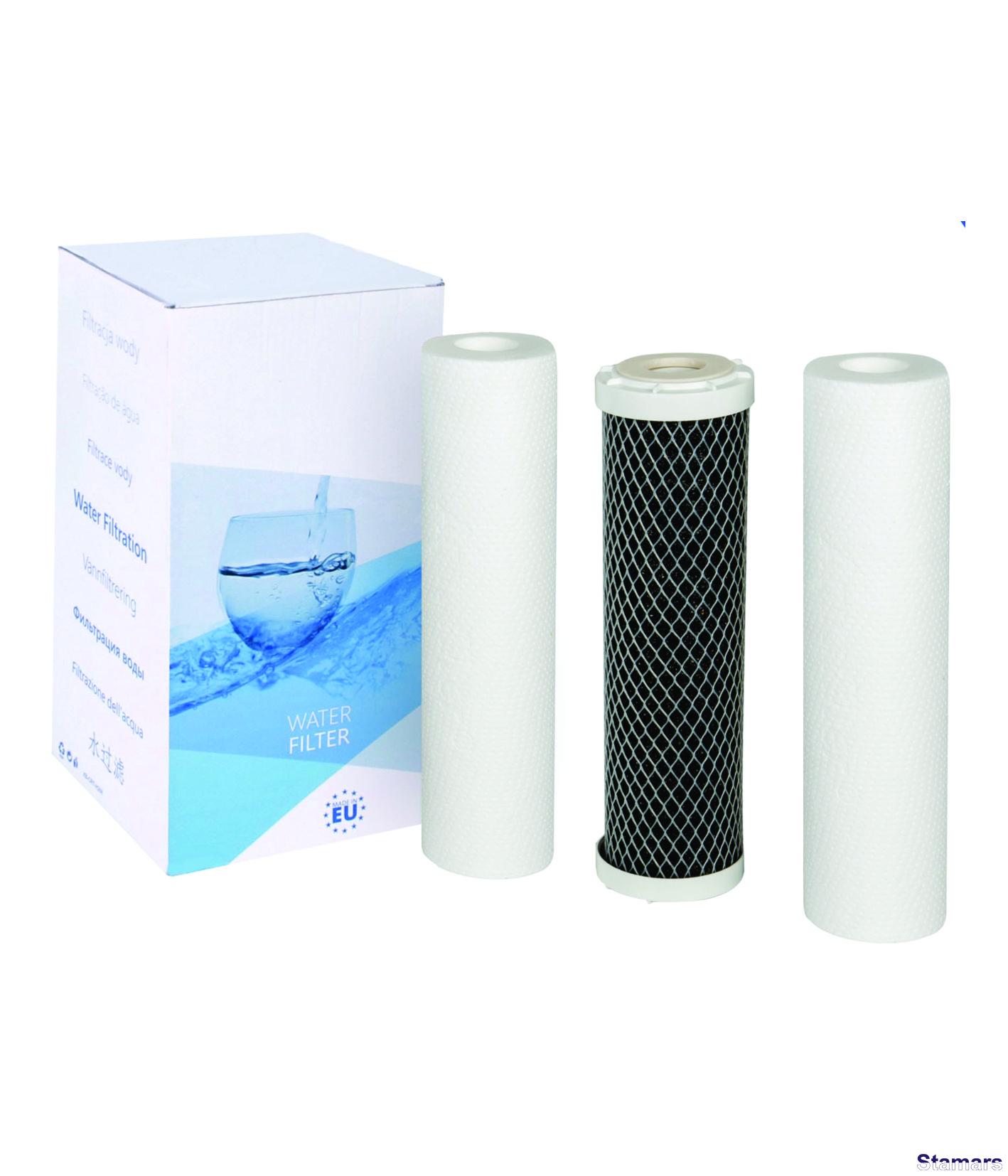 Komplektā FP3-CRT ietilpst trīs kārtridži 10”: FCPS20 un FCPS5 - mehāniskie kārtridži (20 un 5 mkm) no polipropilēna šķiedras. Attīra ūdeni no smiltīm, dūņām, rūsas un citiem mehāniskiem netīrumiem. FCCBL - ogles bloka kārtridžs tiek izgatavots no speciālas aktīvētas ogles, kas attīra ūdeni no 99% brīva hlora un citām organiskām vielām, fenola, benzola, līdz 85% pesticīdiem, uzlabo ūdens smaržu un garšu.