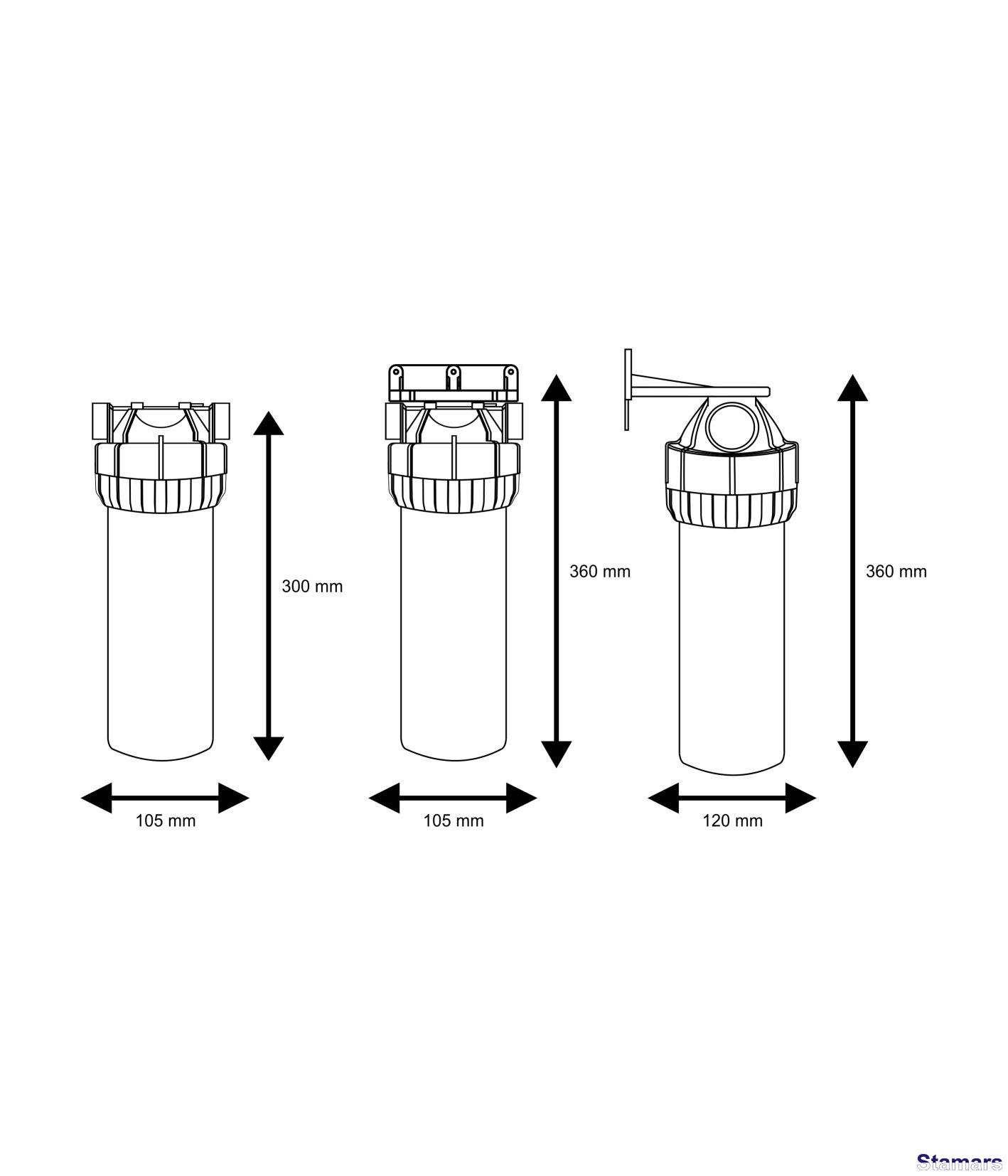 10” filtra komplekts: trīsdalīgs korpuss ar caurspīdīgu kolbu, atgaisotāju un misiņa vītņu ieliktņiem, kronšteinu, atslēgu un bakteriostatisko centralizācijas gredzenu.
