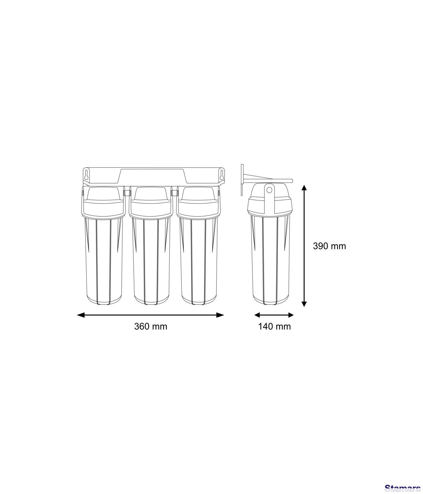 10” trīs korpusu filtrācijas sistēmas komplekts: korpusi ar caurspīdīgām kolbām, atgaisotājiem un misiņa vītņu ieliktņiem, kronšteinu, atslēgu un bakteriostatiskiem centralizācijas gredzeniem. Кatrs filtra korpuss tiek aprīkots ar divām gumijas blīvēm galvā un kolbā.