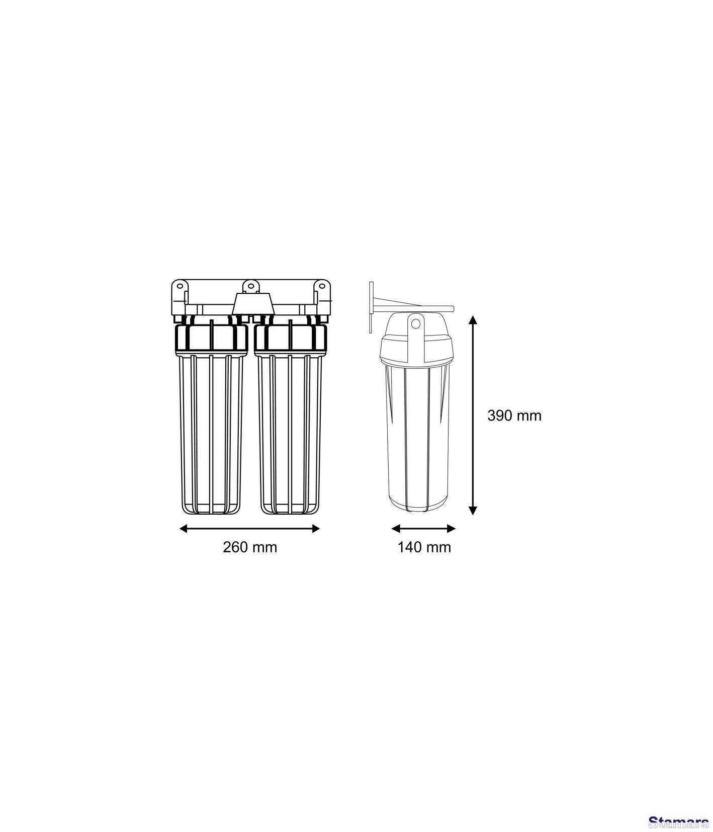 10” divu korpusu filtrācijas sistēmas komplekts: korpusi ar caurspīdīgām kolbām, atgaisotājiem un misiņa vītņu ieliktņiem, kronšteinu, atslēgu un bakteriostatiskiem centralizācijas gredzeniem. Кatrs filtra korpuss tiek aprīkots ar divām gumijas blīvēm galvā un kolbā.