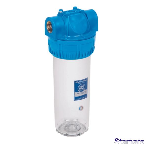 10” trīsdalīgs filtra korpuss ar caurspīdīgu kolbu, atgaisotāju un misiņa vītņu ieliktņiem.