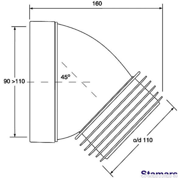 Kanalizācijas pieslēgums, īss 180mm, leņķis 45 grādi. Ieplūde 90-110mm ar lūpu blīvējumu, izeja 110mm.