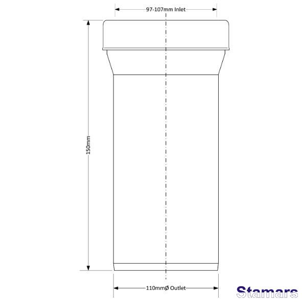 Kanalizācijas pieslēgums, īss. Ieplūde 97-107mm ar lūpu blīvējumu, izeja 110mm.