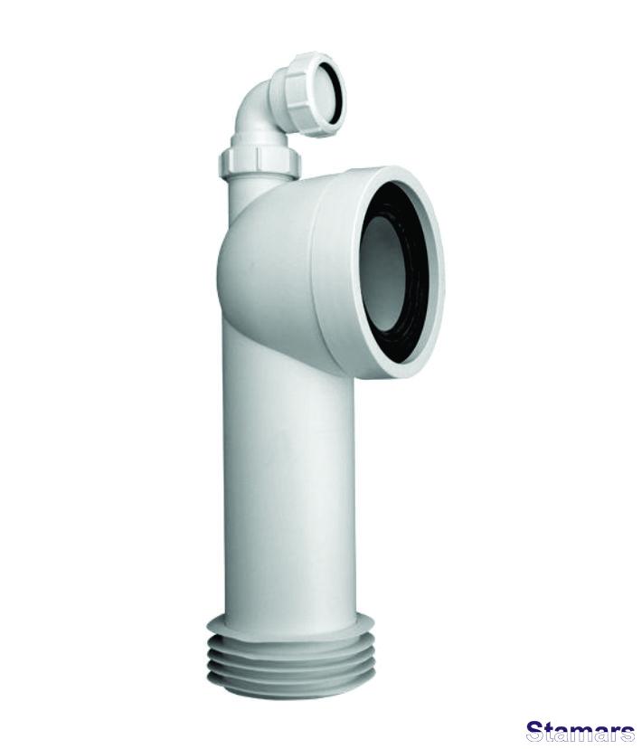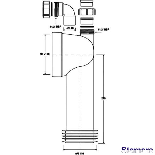 Kanalizācijas pieslēgums, garš 275mm, 90 grādu leņķis, ar 40mm izvadu. Ieplūde 90-110mm ar lūpu blīvējumu, izeja 110mm ar atloka blīvējumu.